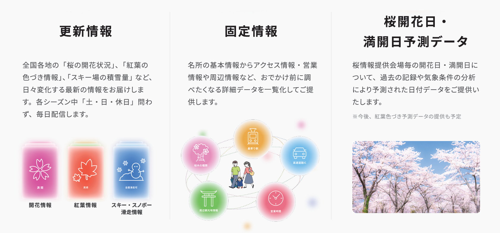 当社が収集している、全国の四季折々の行楽・観光情報データの提供サービスです