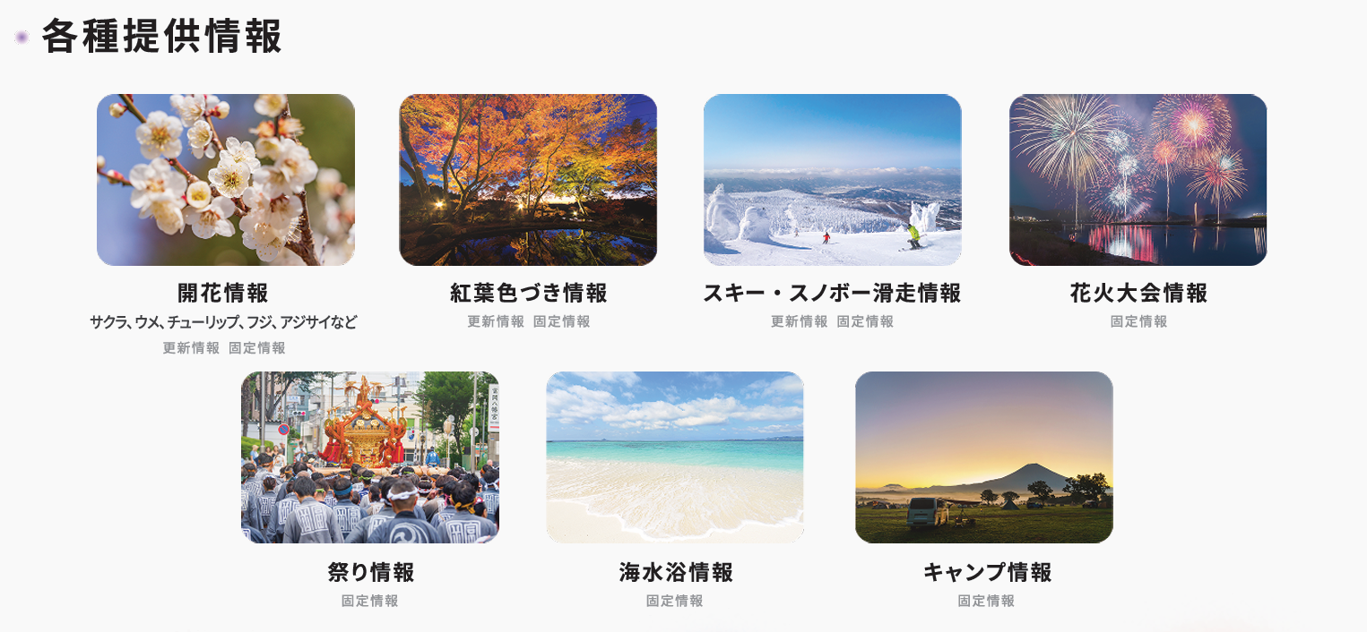 30年以上に渡る歴史と確かなノウハウで、桜の開花情報、紅葉の色づき情報、スキー場の積雪量、お祭り・花火大会など、充実した旬の情報をお届けします。